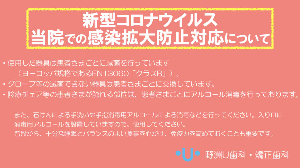 患者さまへ 野洲U歯科・矯正歯科では、新型コロナウイルスをはじめとする感染予防および拡散防止のため、患者さまには以下のご協力をお願いいたします。 ・風邪のような症状のある方は来院をお控えくださいますよう、お願いいたします。・入り口に消毒液をご用意しております。来院の際にご利用ください。