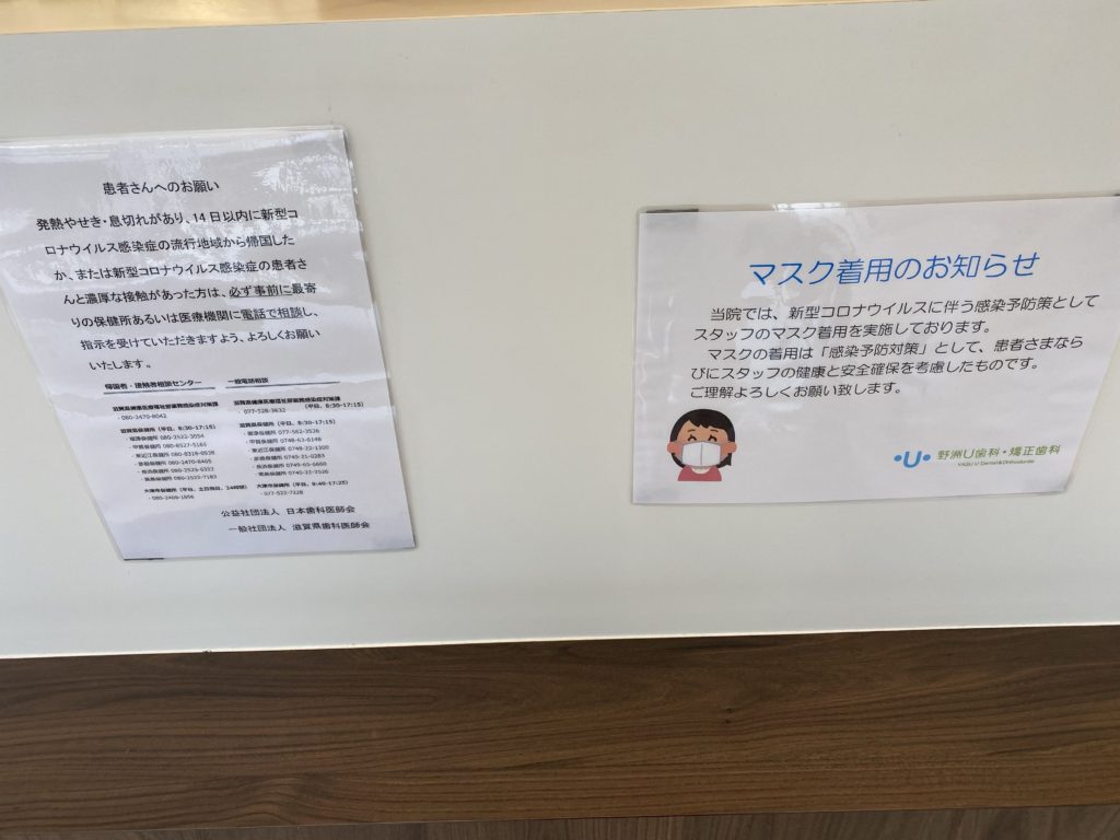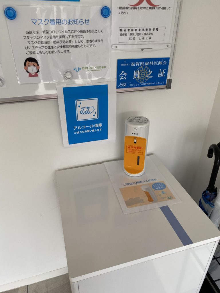・マスクの着用・各チェアへの消毒液設置と診療毎のチェア消毒・定期的な換気・日々のスタッフの健康管理としての問診・体温確認