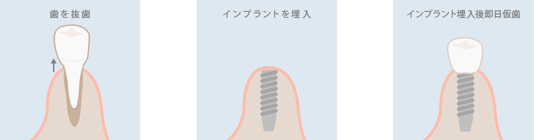 抜歯→インプラント埋入→仮歯の装着という工程が1日で完結するというインプラント治療です。