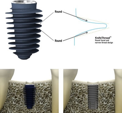 その特徴の一つにナイフスレッドがあります。メガジェンのインプラントはスクリュータイプでインプラント体にネジ山が切られていますが、そのネジ山がナイフのようになっているため、あごの骨を押しつぶすことなく鋭く切り込んでかつ骨を圧縮してます。インプラントがしっかりと骨に固定されます。骨とインプラント体との接触面積が大きければそれだけ骨との結合度合いが大きくなるため、ネジ山の面積を大きくするなどの工夫もなされています。