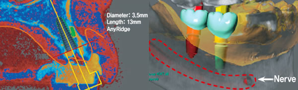 これらのソフトウェアでは骨の形状はもとより骨密度が精密に色分けされるため、客観的に骨の幅・長さ・硬さや骨密度を把握することが出来ます。これらが分かることによってインプラントのメーカー、さらにその中で何の種類のインプラントを使用することが適切かを判断することが出来ます。